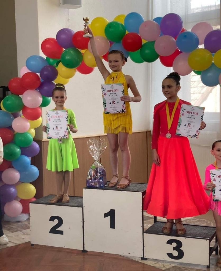 Predstavili sa nám dievčatká: Radka Plučinská (5r.)-Slovenská Ves, Sára Galliková (6r.), Natália Mešárová (5r.), Diana Lojeková (8r.), Eliška Ďurišová 8r.), Simona Suchanovská (8r.), Natália Ann Mc Arthur (9r.). Keďže sú to začínajúce tanečnice všetky boli ohodnotené zlatou medailou, vyskúšali si aj stupne víťazov. Obdivujeme ich odvahu vôbec sa postaviť na tanečný parket, predviesť sa a ukázať svoje prvé kroky v tancoch Waltz, Valčík, Chacha, Jive. Super naše „SNEŽIENKY“ blahoželáme!